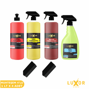 Luxor Kimya Muhteşem 4'lü Set, araç temizliği ve bakımını kolaylaştıran, pratik ve etkili bir çözümdür. Profesyonel sonuçlar, kolay kullanım ve ekonomik fiyat avantajıyla, aracınızın kusursuz görünmesini sağlayacak mükemmel bir üründür. Hızlı temizlik ve parlaklık, günlük rutinlerinizde zaman kazandırırken, aracınızın uzun ömürlü temizliğini de korur.